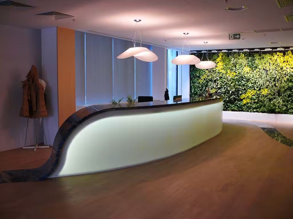 Każda lada jest projektowana zgodnie z Twoją wizją – od minimalistycznych brył po efektowne, niestandardowe formy w dowolnym rozmiarze, długości i kształcie. Dzięki indywidualnemu podejściu powstają unikalne realizacje, które podkreślają prestiż holu, korytarza, poczekalni czy lobby.